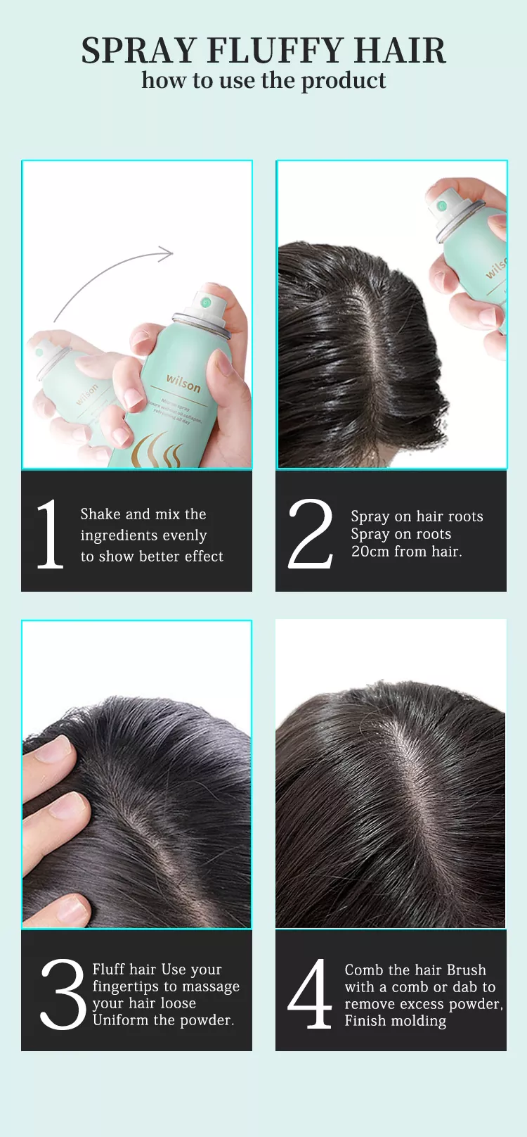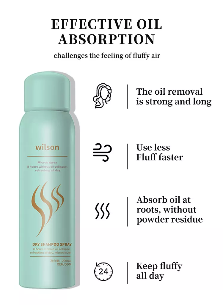 Wilson Instant no-wash cool dry shampoo spray heeft veel oliehoofden gered die tijdelijk naar buiten kunnen gaan, kan het haarprobleem niet wassen, de belangrijkste grondstof is rijstzetmeel, zetmeel heeft een poreuze structuur, adsorptiviteit, is een veel voorkomende hygroscopische adsorptiegrondstof, kan overtollige olie op de hoofdhuid effectief absorberen en het haarvuil reinigen, sprayen en wat oppervlakteactieve stoffen en elektrostatische componenten toevoegen om de verwijdering van producten uit het haar te vergemakkelijken. Voel je fris en natuurlijk na gebruik.